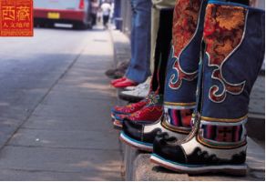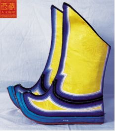 西藏高原地域遼闊,每個地區(qū)都有屬于自己的鞋子。藏族男女鞋,外觀雖然很像舞臺上古裝戲里穿的靴子,但用牛皮做底,底高二寸,腰高至小腿之上,鞋面用紅綠相間的毛呢裝飾,鞋腰也有線條、花紋,鞋幫用各色絲線或各色皮革、氆氌、金絲緞制成。人們能從一個人所穿的鞋子判斷出一個人的職業(yè)和社會階層。