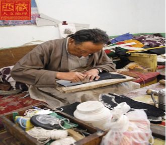 藏靴最難做的部分就要數(shù)扎鞋底了。幾厘米厚的皮鞋底需要用錐子一個個扎孔,用針一個個穿線,完全是手工活,工人們手上全是水皰和傷疤,用多厚的頂針都不管用。相比而言,做鞋腰和鞋筒就比較輕松,有些部分還能用上機(jī)器。鞋底做好之后和鞋腰、鞋幫縫在一起還不算完工,還要用一種特殊的工具把鞋里撐起來,這樣才不會變形。同去的一位記者訂做了一雙靴子,問多長時間能完工,赤列塔青吸著鼻煙,慢條斯理地說20天應(yīng)該沒有問題吧。從這里也可以看出制作藏靴手工活的精細(xì)和講究。