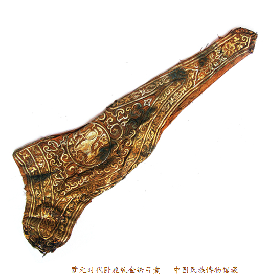 中國(guó)民族博物館館藏的臥鹿紋金繡弓囊通長(zhǎng)72CM,最寬處25CM,最窄處6.5CM。面料為絹地,呈深褐色。專家推斷其入土前應(yīng)內(nèi)襯樺樹皮或獸皮類框架。弓囊正面以銀裹金錢繡滿圖案,整體金碧輝煌。由于埋藏地下數(shù)百年,弓囊兩端的鐵質(zhì)穿環(huán)和皮條已銹蝕腐爛。
