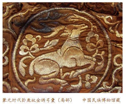 如果說在回回織工梭下的納石夫圖案總是帶有濃郁的伊斯蘭風(fēng)情,而我們?cè)谶@只金繡撒袋上見到的臥鹿紋,則已是純粹中國(guó)特色的春水題材了。它是出自一位已經(jīng)深受中華文化濡染的回回繡女之手?還是一位已是織金高手的中原繡娘穿針引線完成了它?不論怎樣,在文化大交流、民族大融合的時(shí)代里,這只金繡撒袋顯露出中西文化合璧一體的氣息。