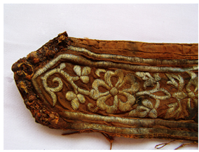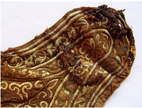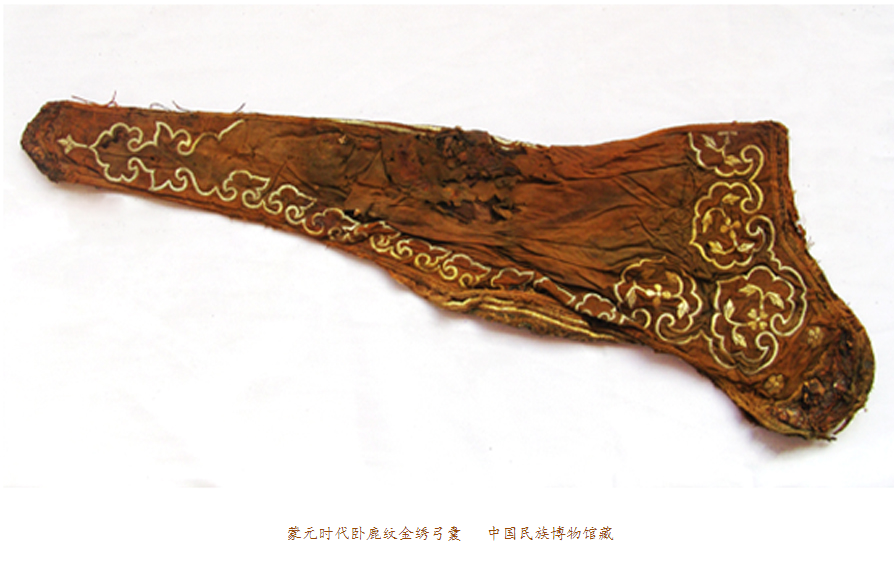 我們?cè)?jīng)描述過元代納石失生產(chǎn)的空前絕后。蒙古民族把對(duì)于黃金的寶愛,傾泄進(jìn)元朝一百年的歷史時(shí)空。在整個(gè)13世紀(jì)的每一個(gè)歷史篇章,都鐫刻著納石失的金縷光影。我們?cè)谑妨侠锟吹剑熳又率羌{石失,天子之裳是納石失,天子之履依然是納石失。那么,蒙元一代,還有什么是用黃金絲線耗盡心血織繡而成的呢?現(xiàn)在,我們看到了這只金繡弓囊。
