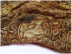 現(xiàn)在,我們就看見一只鹿,靜臥于金繡弓囊的中央。飛揚(yáng)流動(dòng)的黃金絲線勾勒出它宛如花朵一般的角,流露出遠(yuǎn)古神話對(duì)于鹿角神力的幻想和贊美。它以溫柔、嫻靜、優(yōu)美的姿態(tài),安祥地伏于卷草花卉紋中。曾經(jīng)與之相伴的弓影早已遠(yuǎn)去,嗖嗖作響的箭聲也已留在歷史那端?,F(xiàn)在,它遺世獨(dú)立。