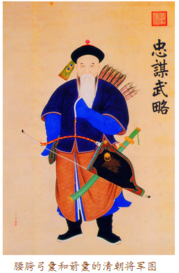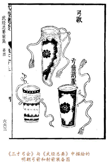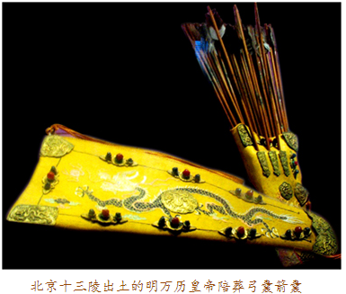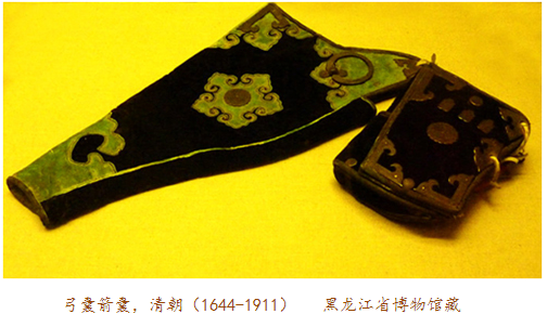 當(dāng)弓囊出現(xiàn)在眼前時(shí),我們應(yīng)當(dāng)想到它的另一半——箭囊。實(shí)事上,古代盛裝弓箭的器物被稱為櫜鞬(gāo jiàn),櫜盛箭,鞬裝弓,多以皮革制作。比如明十三陵出土的萬(wàn)歷皇帝陪葬品櫜鞬,就用皮革縫制,外敷黃色素緞,金繡龍紋,鑲嵌金飾件及各色寶石。一般來說,弓囊為上寬下窄的袋形,箭囊則為長(zhǎng)方形。在蒙古語(yǔ)中,弓囊與箭囊合稱為“撒答”。因?yàn)椤按稹迸c“袋”讀音相近,所以元代的漢族作家便在作品中將之寫為“撒袋”。這樣,“撒袋”一詞便入了漢語(yǔ)詞匯,特指裝弓盛箭的袋子。