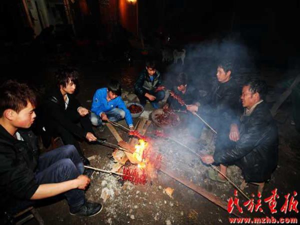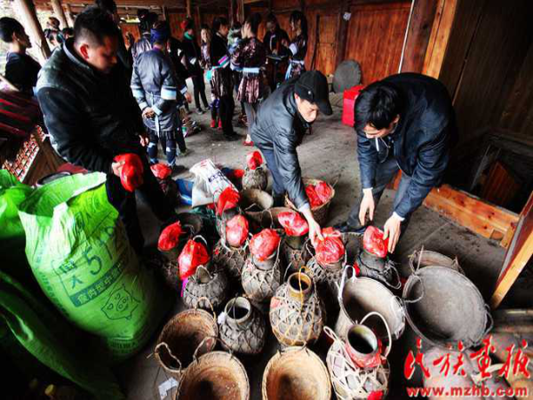 第一天的婚宴在上午11時(shí)左右開(kāi)始,來(lái)參加婚禮的客人都要帶上彩禮,臨近主人家門(mén)時(shí)還要燃放鞭炮,主人則熱情相迎。彩禮主要包括稻谷、米酒、土布和數(shù)量不等的人民幣,人民幣有單獨(dú)給的也有和實(shí)物放在一起給的。主人對(duì)客人送的彩禮要及時(shí)登記造冊(cè),以便婚宴結(jié)束后要給送實(shí)物彩禮的客人還禮。婚宴的地點(diǎn)均設(shè)在房前屋后的院子里、馬路邊或臨近鼓樓的廣場(chǎng)上,一般都有十多桌。桌上的菜肴除了紅肉、燉肉和烤肉外,還有各種酸菜及炒菜等,共有十來(lái)個(gè),主食是小黃當(dāng)?shù)刈援a(chǎn)的糯米飯,酒水則以自家釀制的米酒為主?;檠玳_(kāi)始,人們邊品嘗豐盛的菜肴邊開(kāi)懷暢飲,主人不停地為客人敬酒添菜。特別值得一提的是,在侗族婚宴上新娘不出來(lái)敬酒;人們飲酒時(shí)也比較文明,沒(méi)有過(guò)分勸酒現(xiàn)象;還有就是對(duì)老年人格外尊敬:寨老們要專(zhuān)門(mén)設(shè)一桌,并且坐在上席,屆時(shí)這些寨老們還要穿上漂亮的民族服裝,纏上頭帕,成為婚禮上另一道靚麗風(fēng)景線。