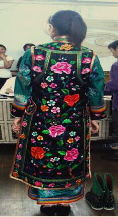 蒙古族科爾沁部的服飾,是內(nèi)蒙古自治區(qū)東部地區(qū)比較有代表性的蒙古族服飾,以用料講究、款式多變,色彩和諧,工藝復(fù)雜見長??茽柷卟菰系拇汤C,早年的時(shí)候,是比較簡單的,后來工藝流程才變得復(fù)雜起來,包括設(shè)計(jì)繡稿、勾稿、染線,上棚,配線,刺繡,下棚等若干步驟,其做工細(xì)膩,講究針法和紋路,每一件繡品都精益求精,一絲不茍,出來的繡品堪稱精品佳作。蒙古族刺繡的針法包括9大類40多種,有齊針、散針、稀針、接針、打籽、退暈等刺繡針法。