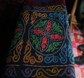 北方少數(shù)民族地區(qū)都沒有養(yǎng)蠶的條件,所以用于刺繡的絲線都需要與中原的物品交流當(dāng)中索取,這也是在蒙藏地區(qū)有用各色的布出現(xiàn)貼花的原因??茽柷哔N花就是把各式各樣布料剪成紋樣貼在布底上再經(jīng)過縫邊,鎖邊而成的一種刺繡種類。這種貼繡在科爾沁蒙古族中是很普及的一種形式。這種貼繡能較好地運(yùn)用大塊面的色彩,用料簡單,是刺繡中常用的一種方法。科爾沁刺繡在面料上刺繡圖案時(shí)用三種方法,第一種是把刺繡的圖案畫在紙上在把紙樣按照輪廓剪下來,然后放在要繡的底樣上,按照紙樣的輪廓進(jìn)行刺繡。第二種方法是把圖案如實(shí)地在錦緞上描下來進(jìn)行刺繡。第三種是直接在錦緞上自由發(fā)揮,繡出各種圖案。