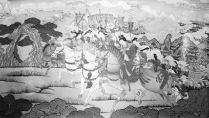 《文成公主進(jìn)藏》及其細(xì)部。規(guī)格:100厘米×60厘米,創(chuàng)作時(shí)間:1985-1993年,作者:夏吾才郎、更登達(dá)吉。這幅作品由夏吾才郎構(gòu)圖,更登達(dá)吉及徒弟上色完成。整幅作品生動(dòng)寫(xiě)實(shí)、布局嚴(yán)謹(jǐn)、色彩淡雅、遠(yuǎn)近相應(yīng),呈現(xiàn)出廣泛的視覺(jué)空間。 解加馨于供圖