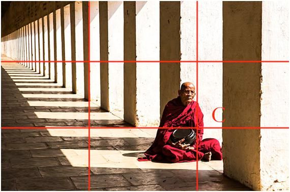 這三張圖都是就是黃金交叉點(diǎn)構(gòu)圖的應(yīng)用,第三張是在緬甸的拍的,當(dāng)時(shí)這個(gè)僧人坐在有光的長廊里,他的頭不在交叉點(diǎn)上,但落在相對(duì)差不多的位置。