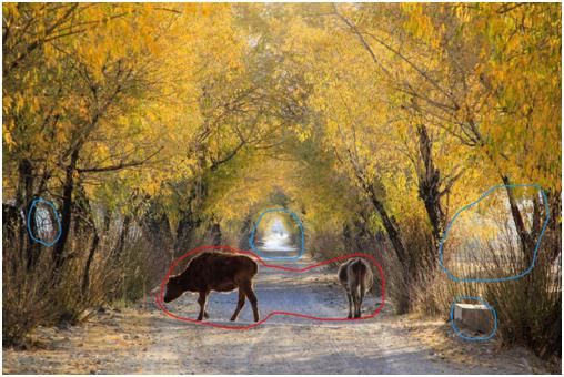 這幅片子用藍(lán)色部分標(biāo)注出來的地方,都是相對(duì)比較亮的有高光的地方,它們對(duì)照片中的主體(圈起的紅色部分),兩只牛形成了干擾,使得觀看者的目光不能集中在主體身上,總是被這幾個(gè)藍(lán)色高光部分所吸引。