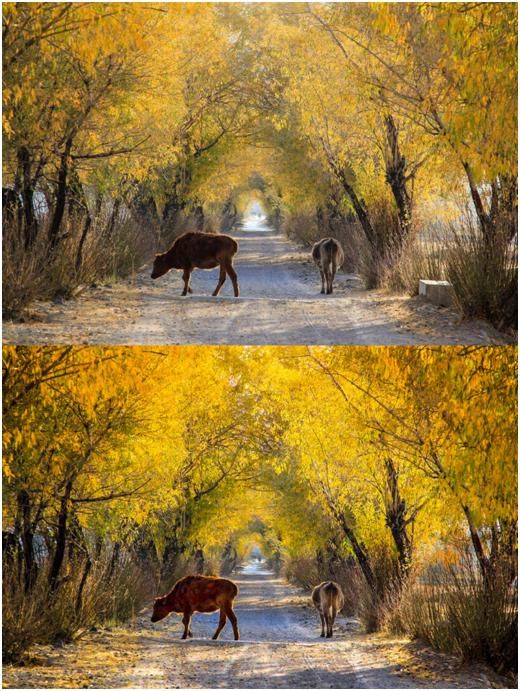 我們將遠(yuǎn)處部分的高光壓低,提亮了一下黃色的樹葉和地面的光照,加強(qiáng)了地面的陰影,這樣就有了一個(gè)比較通透明快的感覺,空間的縱深效果也有了加強(qiáng)。另外也稍微提亮了牛身上的亮度,但不能提的太亮,因?yàn)檫@樣的話會(huì)使片子的噪點(diǎn)比較大,同時(shí)也會(huì)失色。